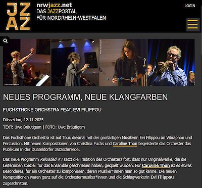 "Ein eindrückliches Konzert mit Kompositionen, die soziale und politische Gegenwartsthemen ebenso wie Naturerfahrungen mit einschlossen. Musik die inhaltlich und ästhetisch relevant war. Das Fuchsthone Orchestra ist eines der wichtigsten Großensembles in der gegenwärtigen Jazzszene. Wobei die Musik weit über die Grenzen des klassischen Jazz und der klassischen Big Band Literatur hinausweist. Das Publikum in der Düsseldorfer Jazz Schmiede war von der Musik gerührt und ergriffen."
